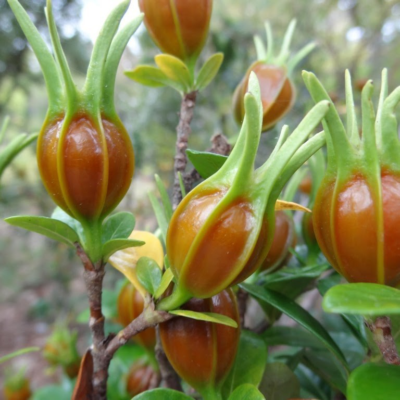 Quả hình thoi hoặc hình trứng hẹp, dài 2cm đến 4,5cm, đường kính 1cm đến 2cm. Màu vàng cam đến đỏ nâu, có khi nâu xám đến đỏ xám, hơi bóng. Có 5 đến 8 đường gờ chạy dọc qua, giữa 2 gờ là rãnh rõ rệt. Đỉnh quả lõm có 5 đến 8 lá đài tồn tại, thường bị gãy cụt. Gốc quả hẹp, có vết cuống quả. Vỏ quả mỏng, giòn, hơi bóng, vỏ quả giữa màu vàng đục, dày hơn.